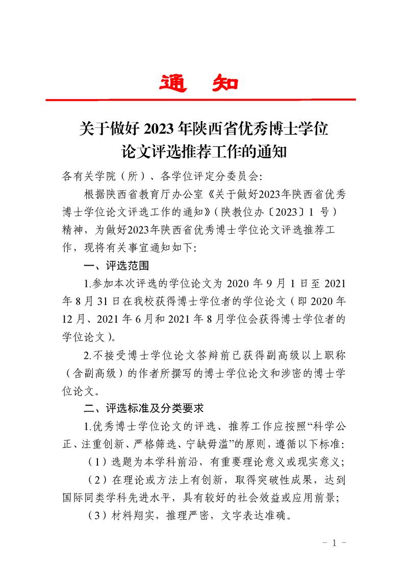 关于做好2023年陕西省优秀博士学位论文评选推荐工作的通知