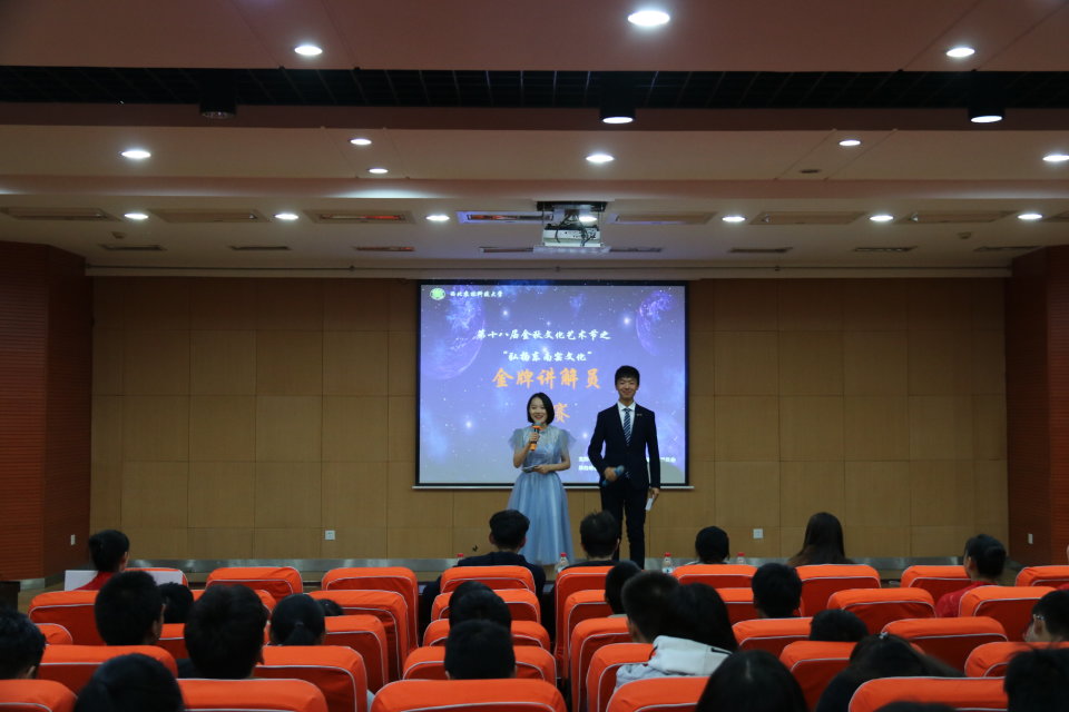 晚上7点30分,比赛正式开始。此次比赛分为能力展示和知识竞答两个环节,对讲解员的现场表现、综合素质、应变能力、形象气质等方面进行综合测评。参赛同学分三组进行比赛,参赛选手依次上台讲解,讲解内容不限。在比赛的能力展示环节中,选手们沉着冷静、声情并茂、各具特色,通过现场讲解和PPT展示,生动形象的向观众介绍他们所讲解的内容。知识竞答环节中,选手们进行头脑风暴,认真思考、回答每一个问题,赢得观众的阵阵掌声与评委老师的赞赏。